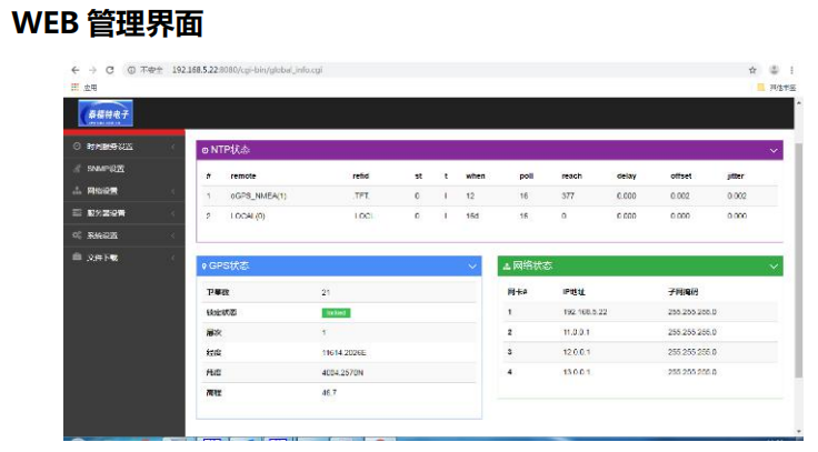●方便快捷、開箱即用,用于對設備進行全局監控; ●含設備運行狀態:NTP狀態、北斗/GPS狀態、網絡狀態等; ●可進行SNMP設置(Trap地址等)、網絡設置、NTP設置; ●可開關服務器當前運行的服務; ●可下載相關配置文件和MIB描述文件。