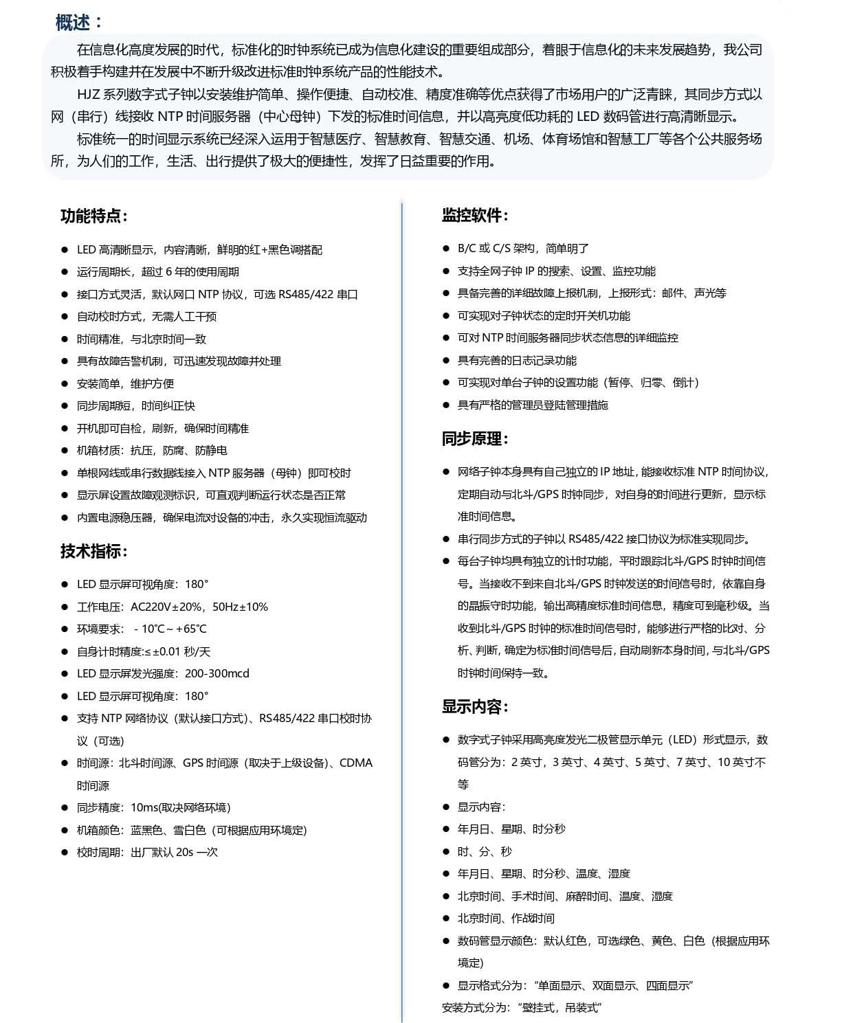 標(biāo)準(zhǔn)化的時(shí)鐘系統(tǒng)已成為信息化建設(shè)的重要組成部分,著眼于信息化的未來(lái)發(fā)展趨勢(shì),我公司積極著手構(gòu)建并在發(fā)展中不斷升級(jí)改進(jìn)標(biāo)準(zhǔn)時(shí)鐘系統(tǒng)產(chǎn)品的性能技術(shù)。HJZ系列數(shù)字式子鐘以安裝維護(hù)簡(jiǎn)單、...